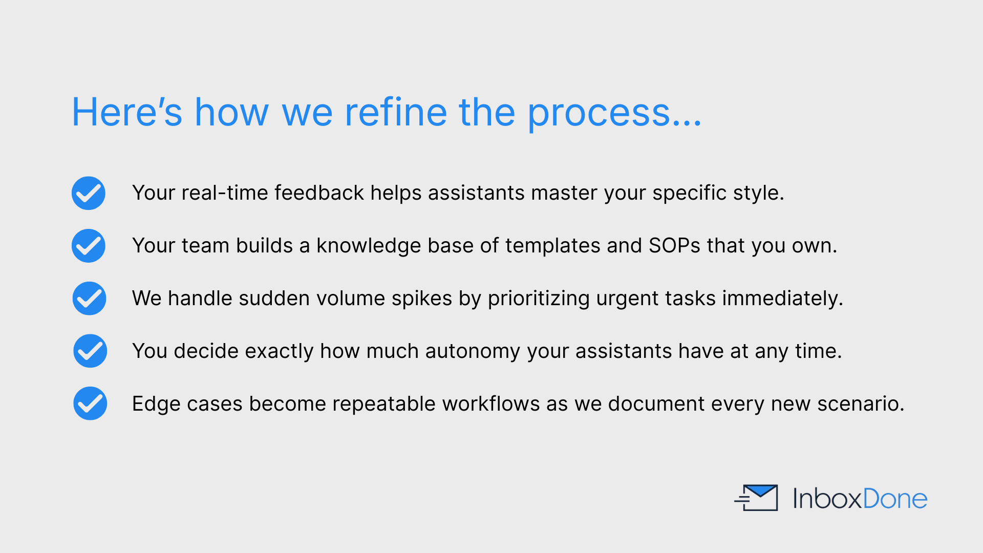 InboxDone assistants incorporate feedback immediately and update templates or documentation to prevent repeat issues.